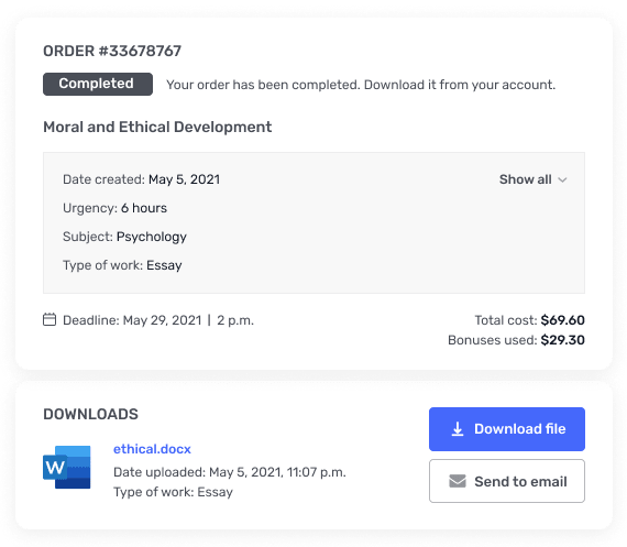 On top of that, editors and proofreaders help students with their academic papers. They double-check every essay for conformity with directives, originality & quality adherence, formatting standards. In case your essay writer has made a mistake, an assigned editor will see and fix it. In the end, you are assured of receiving a 100% mistake-free and unique essay.